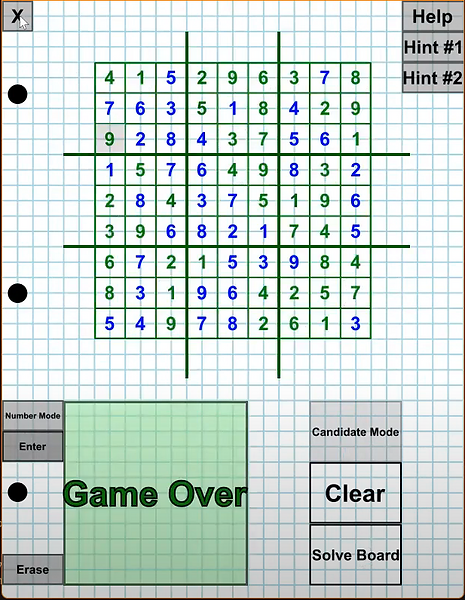 In my game, I included two types of hints (one that highlighted the only possible number a square could be and another that removed candidates that were not possible), a help menu, a start menu, and the ability to select difficulty levels that load randomized boards.